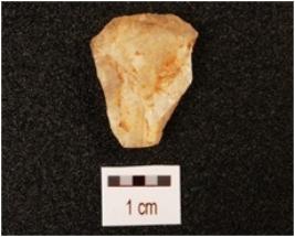 | Description / विवरण | A flake, made on quartz with flake scars on dorsal side, prepared platform and bulb on ventral. |