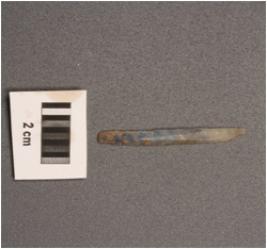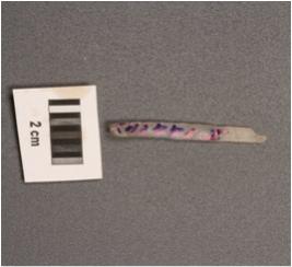 | Description / विवरण | Parallel sided microlithic blade with two ridges on dorsal side, diffused bulb on ventral partly broken at distal end, trapezoidal in section and use wear marks on cutting edges. |