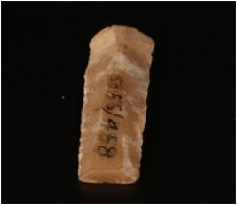 | Description / विवरण | A chert blade, parallel sided with two ridges on the dorsal side. Slightly chipped off at one end, cutting edges with use ware marks and trapezoidal section. |