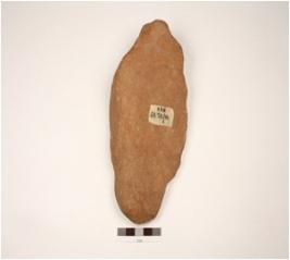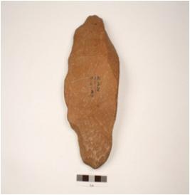 | Description / विवरण | Chopper made on quartzite pebble, flake, cortex visible on dorsal side and prominent bulb on ventral side, wavy cutting edge. |