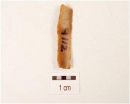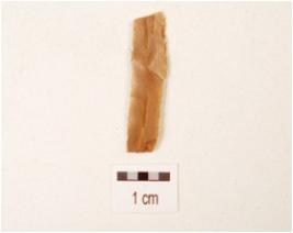| Description / विवरण | Fragment of a chert blade with prominent mid-ridge on dorsal side, use-wear marks on cutting edge and tirangular in section. |