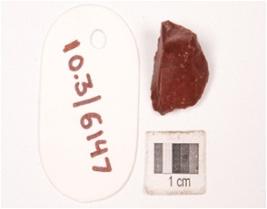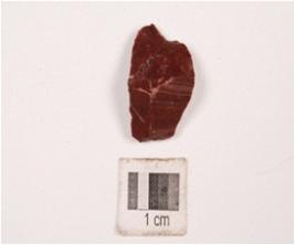| Description / विवरण | A chert flake with three flake scars on the surface while the other side is smooth. |