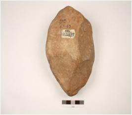 | Description / विवरण | Handaxe made on quartzite pebble, bifacial with flake scars, pointed distal end, wavy cutting edges. |