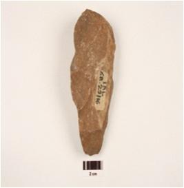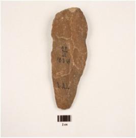 | Description / विवरण | A handaxe made on end struck quartzite flake, use-wear marks on cutting edges, flake scars on both sides, triangular in section. |