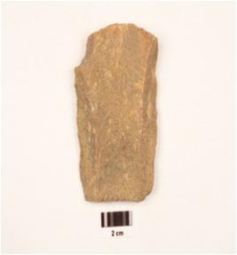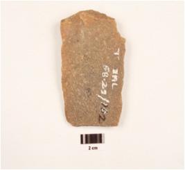 | Description / विवरण | A scraper made on end struck quartzite flake, two ridges on dorsal surface, partly broken from one end, trapezoidal in section, prominent bubl on ventral side, use-wear marks on cutting edges. |
