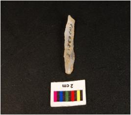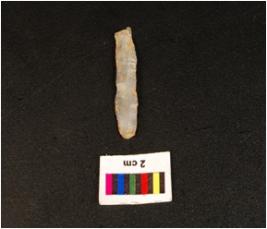 | Description / विवरण | Parallel side microlithic blade with wavy mid ridge on dorsal triangular in section, broken distal end, bulb on ventral and use wear mark along the cutting edges. |