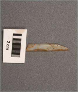 | Description / विवरण | A blunt point made on chalcedony blade with sharp edges, two ridge on dorsal diffused bulb on ventral and trapezoidal in section. |