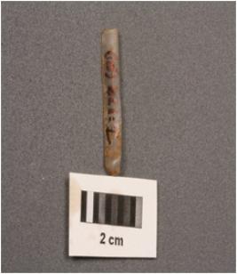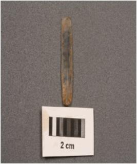 | Description / विवरण | A parallel sided blade with use-wear marks on cutting edges, prominent bulb on ventral side, prominent mid-ridge on dorsal and triangular in section. |