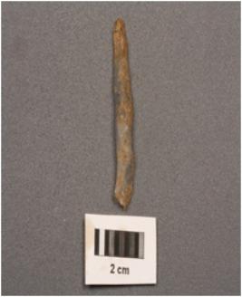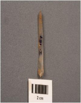 | Description / विवरण | Parallel sided microlithic blade with a ridge on dorsal side, diffused bulb on ventral partly broken along distal end and triangular in section. |