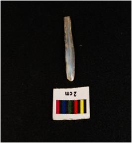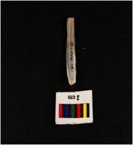 | Description / विवरण | Parallel sided blade, double ridge on dorsal trapezoidal in section, bulb on ventral side, broken at distal end and use wear mark along the cutting edges. |
