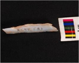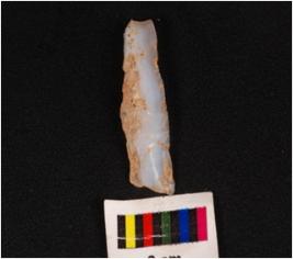 | Description / विवरण | Parallel sided blade with a mid ridge on dorsal side, diffused bulb on ventral side, use wear marks on edges and broken at distal end. |