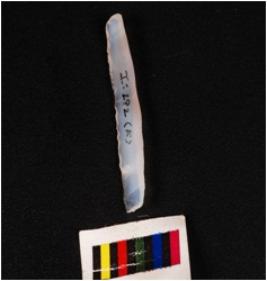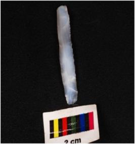 | Description / विवरण | A blade with a mid-ridge on dorsal triangular section, diffused bulb on ventral use-wear marks along the cutting edges, and raw material was given heat treatment. |