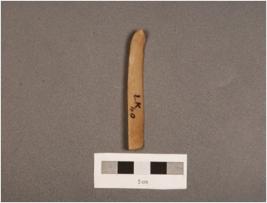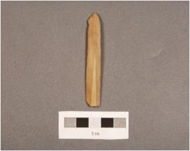 | Description / विवरण | A blade made on chert with mid-ridge on dorsal side, use-wear marks along the cutting edges, triangular section. |