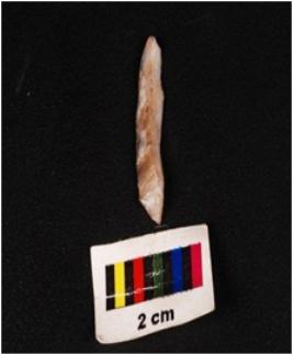 | Description / विवरण | A blade with a mid-ridge on dorsal side, triangular in section, diffused bulb on ventral and raw material was given heat treatment. |