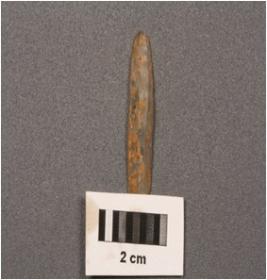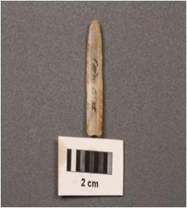 | Description / विवरण | Chalcedony parallel sided blade with a double ridge on dorsal, trapezoidal section and broken from distal end. |