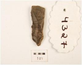| Description / विवरण | A flake made on chert stone, irregular cutting edges and flake scars visible at one side. |