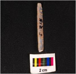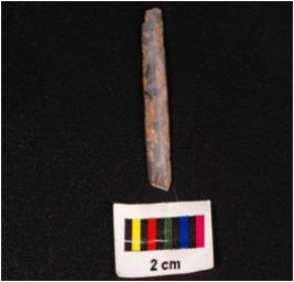 | Description / विवरण | Parallel sided blade of chalcedony withg two ridge on dorsal trapezoidal section, prepared platform, use wear marks on the cutting edges and distal end broken. |