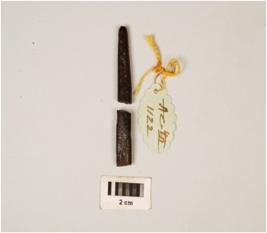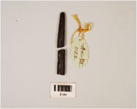 | Description / विवरण | Iron nail with head broken, pointed end and rectangular cross section, corroded surface. |