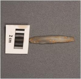 | Description / विवरण | Chalcedony parallel sided blade with ridge on dorsal triangular section and use wear on edges. |