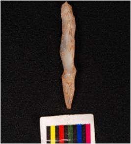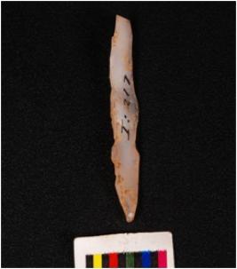 | Description / विवरण | Chalcedony stone blade, dorsal is rough and ventral is smooth and use wear mark on edge. |