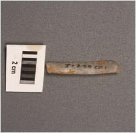 | Description / विवरण | Parallel chalcedony blade with mid ridge on dorsal diffused bulb on ventral and use wear marks on both edges. |