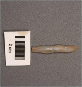 | Description / विवरण | Parallel sided blade with use wear marks on working edges, diffused bulb on ventral, striking platform at proximal end and distal end is broken. |