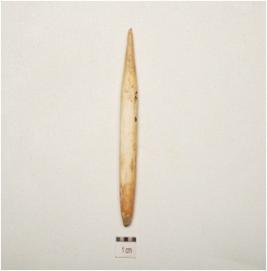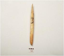 | Description / विवरण | Bone stylus chipped off from surface, pointed one end and broken on other end, polished and rough surface. |