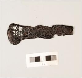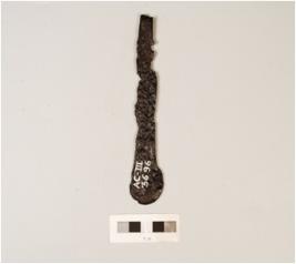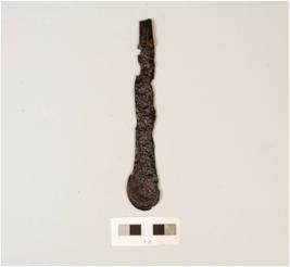 | Description / विवरण | Broken iron spetula with a flat round head and a thin rectangular cross section, corroded surface. |