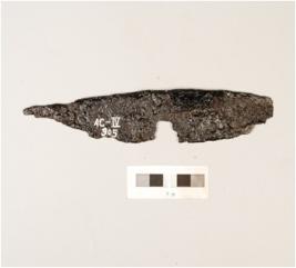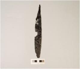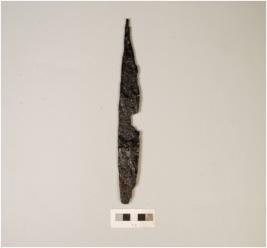 | Description / विवरण | Broken knife with a broken point, part of handle portion visible, corroded surface with sharp working edge. |