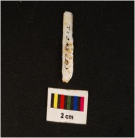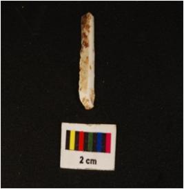 | Description / विवरण | Parallel sided chert blade, two-ridges on dorsal, flat ventral, irregular edges and diffused bulb, on ventral. |