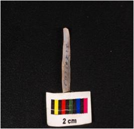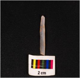 | Description / विवरण | Blunted blade of chalcedony with two ridge on dorsal side, trapezoidal section, diffused bulb on ventral side, distal end broken and the raw material was given heat treatment. |