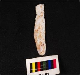 | Description / विवरण | A chert blade with a mid-ridge on dorsal triangular in section, diffused bulb on ventral and use-wear marks along the cutting edges. |