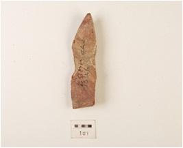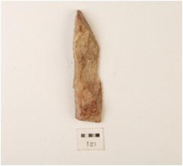 | Description / विवरण | A blade made on chert, prepared platform, flake scars on dorsal side, triangular section and sharp cutting edge. |