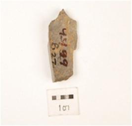 | Description / विवरण | A flake made on chert, flake scars on dorsal side, rectangular section and use wear marks on edges. |