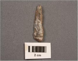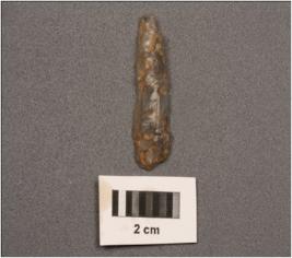| Description / विवरण | Parallel sided chalcedony blade, two ridges on dorsal , use wear on edge and prominent bulb on ventral. |