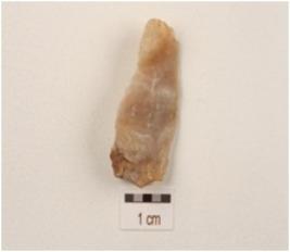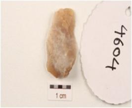 | Description / विवरण | Flake made on chert with a ridge on dorsal ridge, prominent bulb on ventral side and use-wear marks along cutting edges. |
