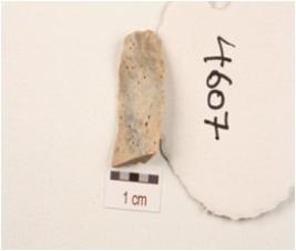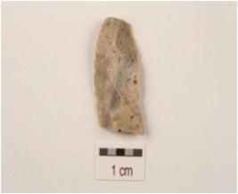| Description / विवरण | Flake made on chert with striking platform, ridge on dorsal side, prominent bulb on ventral side use-wear marks along cutting edges and triangular in section. |