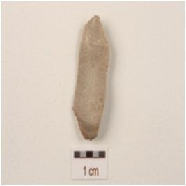 | Description / विवरण | Flake made on chert with prominent ridge on dorsal side, diffused bulb on ventral side and use-wear marks along cutting edges. |