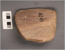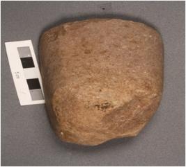 | Description / विवरण | Stone celt, partly broken on one side, polished surface visible round top, sloping down visible. |