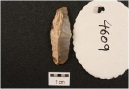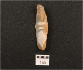 | Description / विवरण | Blade made on chert, prepared platform with mid-ridge on dorsal side, bulb on ventral side, use-wear marks along cutting edges, cortex visible on dorsal and triangular in section. |