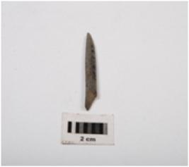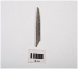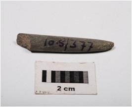 | Description / विवरण | Fragment of a stone point. Narrow with polished surface and circular in section. Pointed one end and broken at other end. |