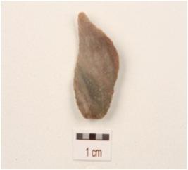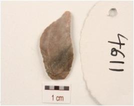 | Description / विवरण | Flake made on chert with two ridges on dorsal side, prominent bulb on ventral ridge and use-wear marks along cutting edges. |