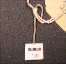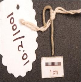 | Description / विवरण | A fish hook made on copper, curved and one end with corroded surface. |