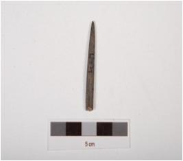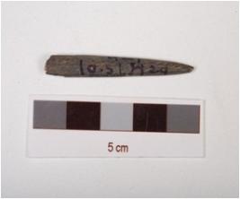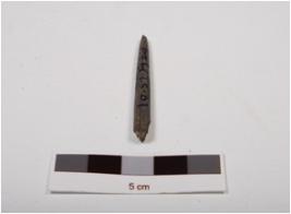 | Description / विवरण | A stone point with polished surface, pointed tip from one end and broken from thick end. |
