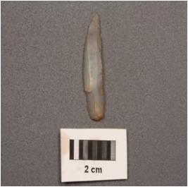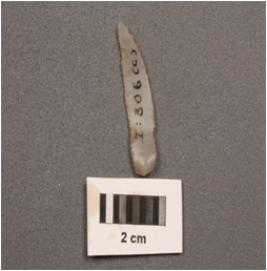 | Description / विवरण | Microlith backed point with double ridges on dorsal, trapezoidal in section, use-wear edges, bulb on ventral side and tapering end. |