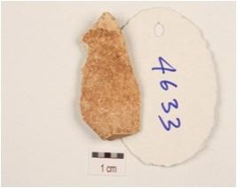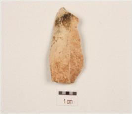 | Description / विवरण | A blade made on end struck chert flake, prepared platform, double ridged, prominent bulb on ventral and used wear marks. |