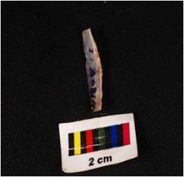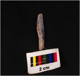 | Description / विवरण | A blade with a mid-ridge on dorsal triangular section and use-wear marks along the cutting edges. |