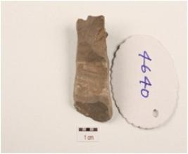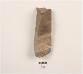 | Description / विवरण | A end scraper made on a chert prepared platform, prominent bulb on ventral, flake scars on surface and used wear marks. |