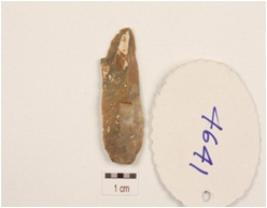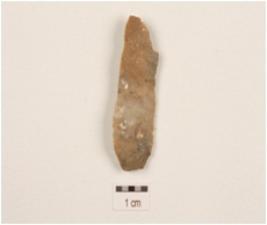 | Description / विवरण | A blade made on end struck chert flake, prepared platform, prominent bulb on ventral single ridge, flake scar on dorsal and used wear marks. |