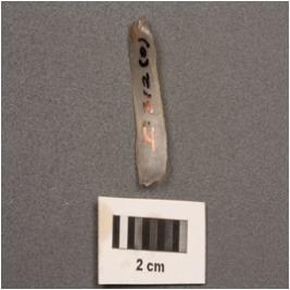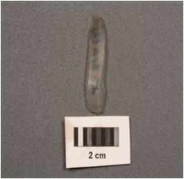 | Description / विवरण | Parallel sided chalcedony blade, wavy ridge on dorsal use wear on edge and prominent bulb on ventral. |